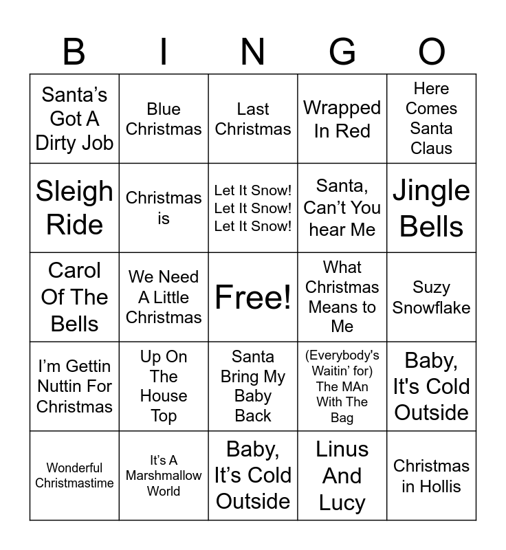 This bingo card has a free space and 60 words: You’re A Mean One, Mr.Grinch, It’s A Marshmallow World, Oh, It’s Christmas!, I’m Gettin Nuttin For Christmas, Linus And Lucy, Frosty The Snowman, Christmas is, Underneath The Tree, Santa, Can’t You hear Me, Santa Tell Me, Wrapped In Red, Drummer Boy, Sleigh Ride, The Polar express, Jingle Bell Rock, Santa’s Got A Dirty Job, Christmas in Hollis, Here Comes Santa Claus, Deck The Hall, Let It Snow! Let It Snow! Let It Snow!, What Christmas Means to Me, Last Christmas, Wonderful Christmastime, Baby, It's Cold Outside, Holidays, Mistletoe and Holly, Little Saint Nick, Feliz Navidad, Jingle Bells, Rockin’ Around The Christmas Tree, All I Want For Christmas Is You, Someday At Christmas, Mele Kalikimaka, Run Rudolph Run, Blue Christmas, Candy Cane Lane, I Want A Hippopotamus For Christmas, We Need A Little Christmas, Winter Wonderland, Carol Of The Bells, Grandma Got Run over by a Reindeer, Up On The House Top, Suzy Snowflake, Christmas Of Love, (Everybody's Waitin’ for) The MAn With The Bag, The Chanukah Song, Caroling Caroling, The Man With All The Toys, Twelve Days Of Christmas b, Santa Bring My Baby Back, Baby, It’s Cold Outside, Step Into Christmas, It’s The Most Wonderful Time Of The Year, I Saw Santa Fishin’, Cool Yule, ( It Must’Ve Been Ol’) Santa Claus, Boogie Woogie Santa Claus, My Kind of Present, Cuddle Up, Cozy Down Christmas and Christmas Wrapping.