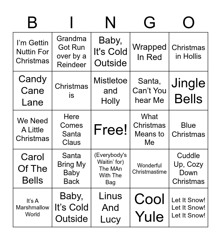 This bingo card has a free space and 57 words: You’re A Mean One, Mr.Grinch, It’s A Marshmallow World, Oh, It’s Christmas!, I’m Gettin Nuttin For Christmas, Linus And Lucy, Frosty The Snowman, Christmas is, Underneath The Tree, Santa, Can’t You hear Me, Santa Tell Me, Wrapped In Red, Drummer Boy, Sleigh Ride, The Polar express, Jingle Bell Rock, Santa’s Got A Dirty Job, Christmas in Hollis, Here Comes Santa Claus, Deck The Hall, Let It Snow! Let It Snow! Let It Snow!, What Christmas Means to Me, Last Christmas, Wonderful Christmastime, Baby, It's Cold Outside, Holidays, Mistletoe and Holly, Little Saint Nick, Feliz Navidad, Jingle Bells, Rockin’ Around The Christmas Tree, All I Want For Christmas Is You, Someday At Christmas, Mele Kalikimaka, Run Rudolph Run, Blue Christmas, Candy Cane Lane, I Want A Hippopotamus For Christmas, We Need A Little Christmas, Winter Wonderland, Carol Of The Bells, Grandma Got Run over by a Reindeer, (Everybody's Waitin’ for) The MAn With The Bag, The Chanukah Song, Caroling Caroling, The Man With All The Toys, Twelve Days Of Christmas b, Santa Bring My Baby Back, Baby, It’s Cold Outside, Step Into Christmas, It’s The Most Wonderful Time Of The Year, I Saw Santa Fishin’, Cool Yule, ( It Must’Ve Been Ol’) Santa Claus, Boogie Woogie Santa Claus, My Kind of Present, Cuddle Up, Cozy Down Christmas and Christmas Wrapping.