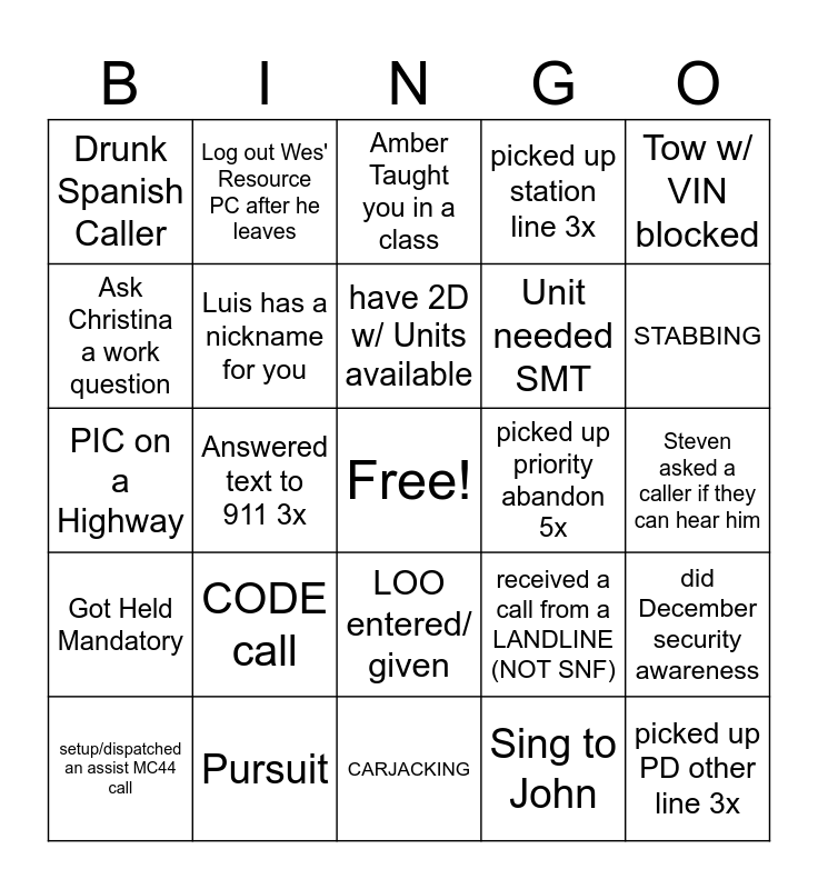 This bingo card has a free space and 40 words: BLDG Fire / Box, PIC on a Highway, MO Caller, Luis has a nickname for you, Pursuit, LOO entered/ given, have 2D w/ Units available, you were here before SBH was a Manager, Tow w/ VIN blocked, Got Held Mandatory, Answered text to 911 3x, picked up station line 3x, picked up PD other line 3x, Steven asked a caller if they can hear him, picked up priority abandon 5x, CODE call, Did a WS w/ Modispacher, Drunk Spanish Caller, purchased from the cart today, Amber Taught you in a class, did December security awareness, Sing to John, Unit needed SMT, Ask Christina a work question, Take a picture of Athena, Your robbery call ends up only being a theft, You have to explain to a caller why their call has been held, TRU closes!!!, Have to explain "no that's another Montgomery County", Paul sneezes over 10 times in a row, Henry sneezes over 8 times in a row, setup/dispatched an assist MC44 call, Send a call to Chevy Chase Village, received a call from a LANDLINE (NOT SNF), STABBING, CARJACKING, CHILD BIRTH, Setup/Dispatch call that required ON CALL ASD, Log out Wes' Resource PC after he leaves and 10-60 return/wanted call.