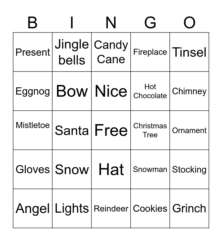This bingo card has a free space and 29 words: Angel, Star, Santa, Wreath, Present, Candy Cane, Bow, Snow, Christmas Tree, Lights, Ornament, Grinch, Reindeer, Cookies, Chimney, Milk, Hat, Gloves, Tinsel, Mistletoe, Snowman, Nutcracker, Hot Chocolate, Eggnog, Fireplace, Jingle bells, Stocking, Nice and Na.