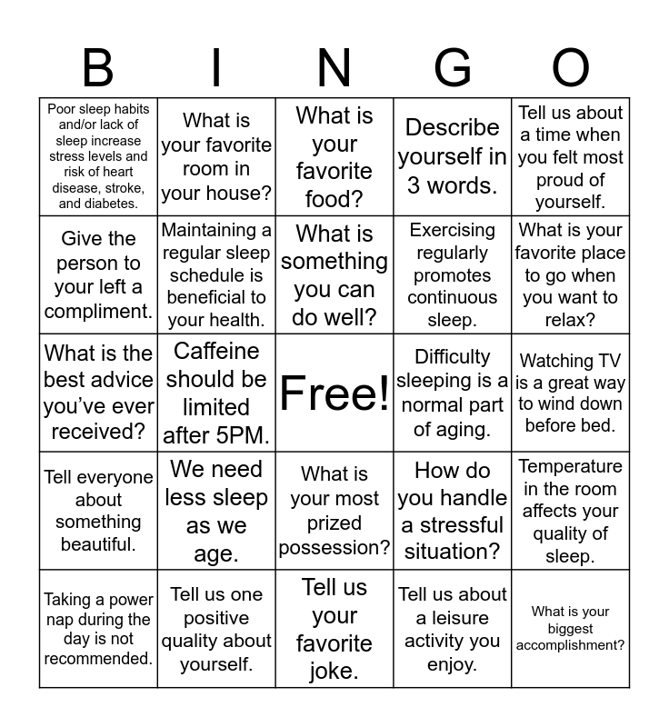 This bingo card has a free space and 24 words: We need less sleep as we age., Tell us one positive quality about yourself., What is something you can do well?, Taking a power nap during the day is not recommended., Tell us about a time when you felt most proud of yourself., Poor sleep habits and/or lack of sleep increase stress levels and risk of heart disease, stroke, and diabetes., Give the person to your left a compliment., What is your favorite room in your house?, Difficulty sleeping is a normal part of aging., What is your most prized possession?, Exercising regularly promotes continuous sleep., What is the best advice you’ve ever received?, How do you handle a stressful situation?, Temperature in the room affects your quality of sleep., Maintaining a regular sleep schedule is beneficial to your health., Tell us about a leisure activity you enjoy., Watching TV is a great way to wind down before bed., What is your favorite food?, What is your favorite place to go when you want to relax?, Caffeine should be limited after 5PM., What is your biggest accomplishment?, Tell everyone about something beautiful., Describe yourself in 3 words. and Tell us your favorite joke..