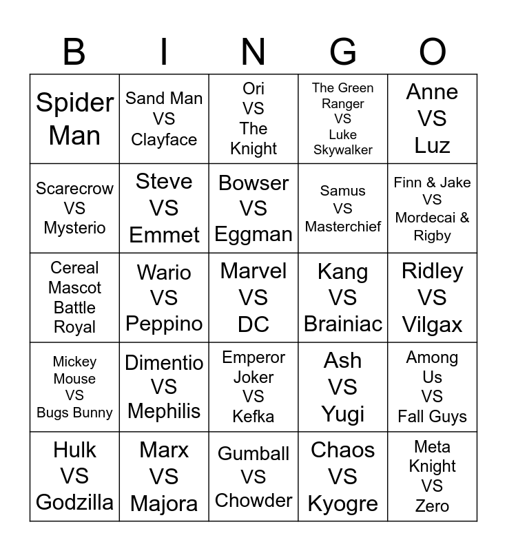This bingo card has a free space and 24 words: Dimentio VS Mephilis, Marx VS Majora, Bowser VS Eggman, Hulk VS Godzilla, Anne VS Luz, Spider Man, Scarecrow VS Mysterio, Sand Man VS Clayface, Kang VS Brainiac, Emperor Joker VS Kefka, Samus VS Masterchief, Cereal Mascot Battle Royal, Ash VS Yugi, Among Us VS Fall Guys, Steve VS Emmet, Chaos VS Kyogre, Ridley VS Vilgax, Ori VS The Knight, Finn & Jake VS Mordecai & Rigby, Wario VS Peppino, Meta Knight VS Zero, Mickey Mouse VS Bugs Bunny, The Green Ranger VS Luke Skywalker and Gumball VS Chowder.