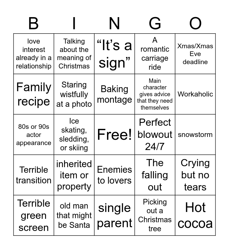 This bingo card has a free space and 74 words: blatant sponsorship, Terrible acting, “It’s a sign”, Small town girl, An wise old man with advice, Widowed old person, Confessing feelings in the last 10 minutes of the movie, Character has Christmas-themed name, Terrible green screen, divorced parents, Mistletoe, red sweater/scarf, Baking montage, Family recipe, A klutzy moment, Ice skating, sledding, or skiing, Town busybody, Workaholic, A ridiculous misunderstanding, 80s or 90s actor appearance, Staring wistfully at a photo, Talking about the meaning of Christmas, A romantic carriage ride, Silly town name, Hot cocoa, Happy ending, A “contest”, Christmas wish comes true, A classic Christmas sweater, Someone is royalty, Xmas/Xmas Eve deadline, An almost kiss, A man in a flannel, Bells are jingling, An argument out of nowhere, Picking out a Christmas tree, Decorating Xmas tree, a recent breakup, dead family member, old person love side plot, single parent, old man that might be Santa, meet cute, small town v big business, old flame, love interest already in a relationship, snows on cue, inherited item or property, saying I love you after knowing each other for like two days, Narration/exposition via character writing, mistaken for a couple, rescue animals, snowstorm, caroling, stock sound effect, Poinsettias, Enemies to lovers, Love interest volunteers other love interest, Predictable dialogue/common phrase, Crying but no tears, Main character gives advice that they need themselves, Ornaments!, Terrible transition, A scene lasts way longer than it should, Perfect blowout 24/7, something’s burning in the kitchen, Dress reveal, Snowball fight, The falling out, Staring wistfully out the window, A wedding, Dancing/“May I cut in?”, Title drop and Proposal.