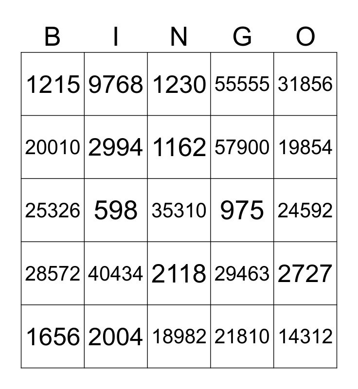 This bingo card has 30 words: 2004, 2024, 598, 596, 1215, 1230, 2994, 2118, 975, 18982, 24592, 35310, 21810, 14312, 19854, 28872, 29463, 28572, 40434, 31856, 25326, 4812, 9768, 57900, 20010, 55555, 2727, 1656, 1162 and 3996.