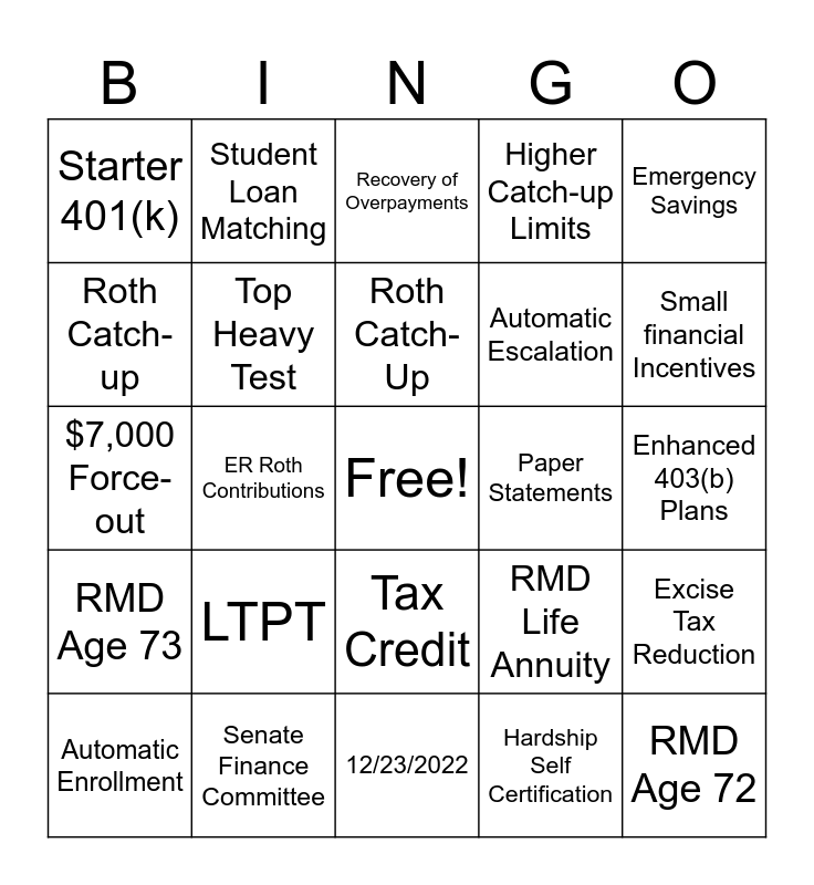 This bingo card has a free space and 24 words: LTPT, Senate Finance Committee, Roth Catch-Up, Automatic Enrollment, Emergency Savings, Starter 401(k), Roth Catch-up, Student Loan Matching, Paper Statements, Tax Credit, Automatic Escalation, $7,000 Force-out, RMD Life Annuity, Excise Tax Reduction, Top Heavy Test, Hardship Self Certification, Enhanced 403(b) Plans, Recovery of Overpayments, Small financial Incentives, ER Roth Contributions, RMD Age 72, RMD Age 73, Higher Catch-up Limits and 12/23/2022.
