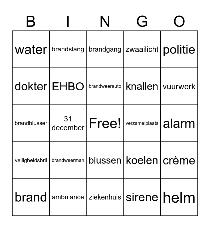 This bingo card has a free space and 24 words: brand, brandweerman, brandweerauto, sirene, politie, water, brandslang, brandgang, verzamelplaats, alarm, brandblusser, EHBO, koelen, crème, dokter, ambulance, ziekenhuis, zwaailicht, vuurwerk, veiligheidsbril, 31 december, blussen, knallen and helm.