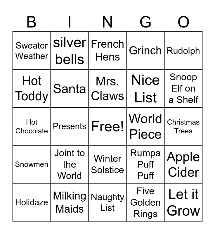 This bingo card has a free space and 39 words: Northern Lights, Mistletoke, Sleigh Bells, Santa, Holidaze, Winter Solstice, Mrs. Claws, Reindeer, Rudolph, Snowmen, Presents, Grinch, Let it Grow, Christmas Trees, World Piece, Joint to the World, Mary Cannabis, Sweater Weather, Toke of Christmas Grass, Rumpa Puff Puff, Hot Toddy, Naughty List, Nice List, Snoop Elf on a Shelf, cookies and milk, scotch tape, ribbons, Jingle Bells, Partridge in a pear tree, silver bells, Fruit Cake, Turtle Doves, French Hens, Milking Maids, Five Golden Rings, Mocking Birds, Apple Cider, Hot Chocolate and Ebeneezer Scrooge.