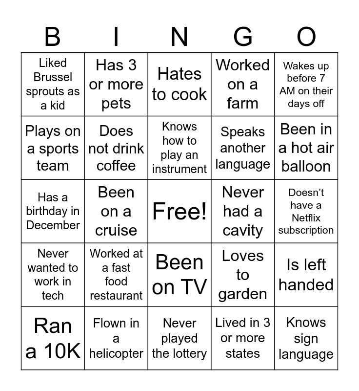 This bingo card has a free space and 24 words: Worked at a fast food restaurant, Flown in a helicopter, Knows how to play an instrument, Ran a 10K, Wakes up before 7 AM on their days off, Liked Brussel sprouts as a kid, Plays on a sports team, Has 3 or more pets, Never had a cavity, Been on TV, Speaks another language, Has a birthday in December, Loves to garden, Is left handed, Does not drink coffee, Lived in 3 or more states, Doesn’t have a Netflix subscription, Hates to cook, Been in a hot air balloon, Been on a cruise, Knows sign language, Never wanted to work in tech, Worked on a farm and Never played the lottery.