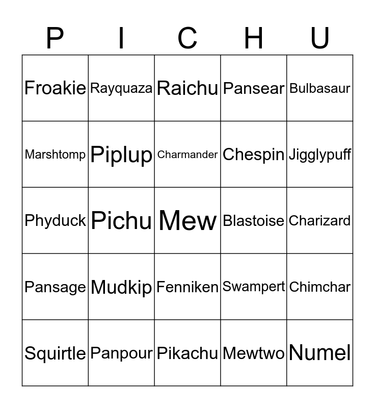This bingo card has 25 words: Mudkip, Pikachu, Charmander, Squirtle, Bulbasaur, Froakie, Marshtomp, Rayquaza, Blastoise, Fenniken, Chespin, Phyduck, Swampert, Chimchar, Piplup, Numel, Charizard, Raichu, Jigglypuff, Pichu, Mew, Panpour, Pansage, Pansear and Mewtwo.