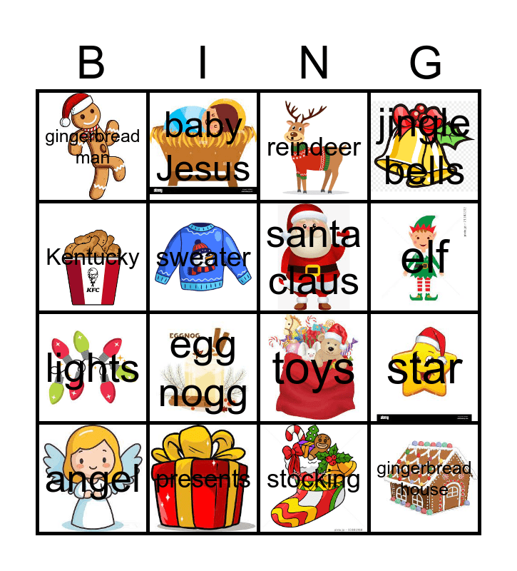 This bingo card has 25 images and 26 words: Candy Cane, Christmas tree, elf, hot chocolate, Kentucky, gingerbread man, sweater, baby Jesus, stocking, snowman, lights, toys, strawberry cake, sleigh, star, ornaments, jingle bells, gingerbread house, reindeer, angel, egg nogg, cookies, presents, snowflake, santa claus and snow.