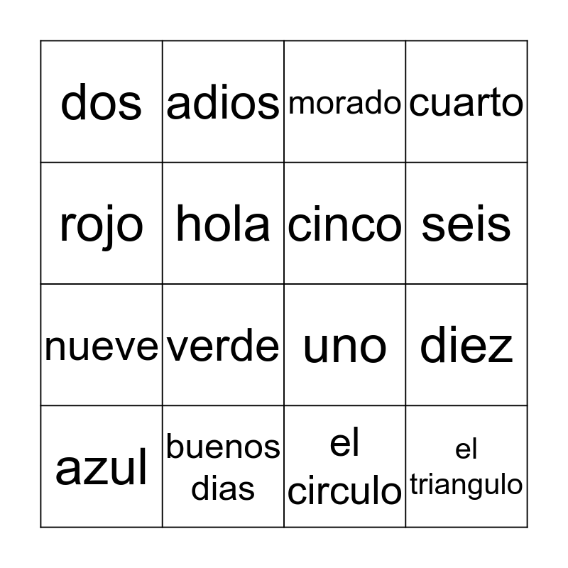 This bingo card has a free space and 15 words: azul, el triangulo, morado, dos, seis, rojo, verde, el circulo, hola, nueve, diez, cuarto, cinco, adios and buenos dias.