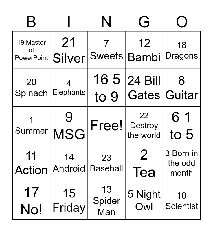 This bingo card has a free space and 24 words: 14 Android, 15 Friday, 16 5 to 9, 17 No!, 18 Dragons, 19 Master of PowerPoint, 20 Spinach, 21 Silver, 22 Destroy the world, 23 Baseball, 24 Bill Gates, 1 Summer, 2 Tea, 3 Born in the odd month, 4 Elephants, 5 Night Owl, 6 1 to 5, 7 Sweets, 8 Guitar, 9 MSG, 10 Scientist, 11 Action, 12 Bambi and 13 Spider Man.