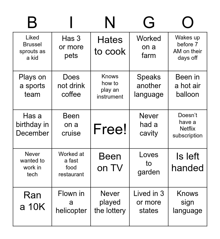 This bingo card has a free space and 24 words: Worked at a fast food restaurant, Flown in a helicopter, Knows how to play an instrument, Ran a 10K, Wakes up before 7 AM on their days off, Liked Brussel sprouts as a kid, Plays on a sports team, Has 3 or more pets, Never had a cavity, Been on TV, Speaks another language, Has a birthday in December, Loves to garden, Is left handed, Does not drink coffee, Lived in 3 or more states, Doesn’t have a Netflix subscription, Hates to cook, Been in a hot air balloon, Been on a cruise, Knows sign language, Never wanted to work in tech, Worked on a farm and Never played the lottery.