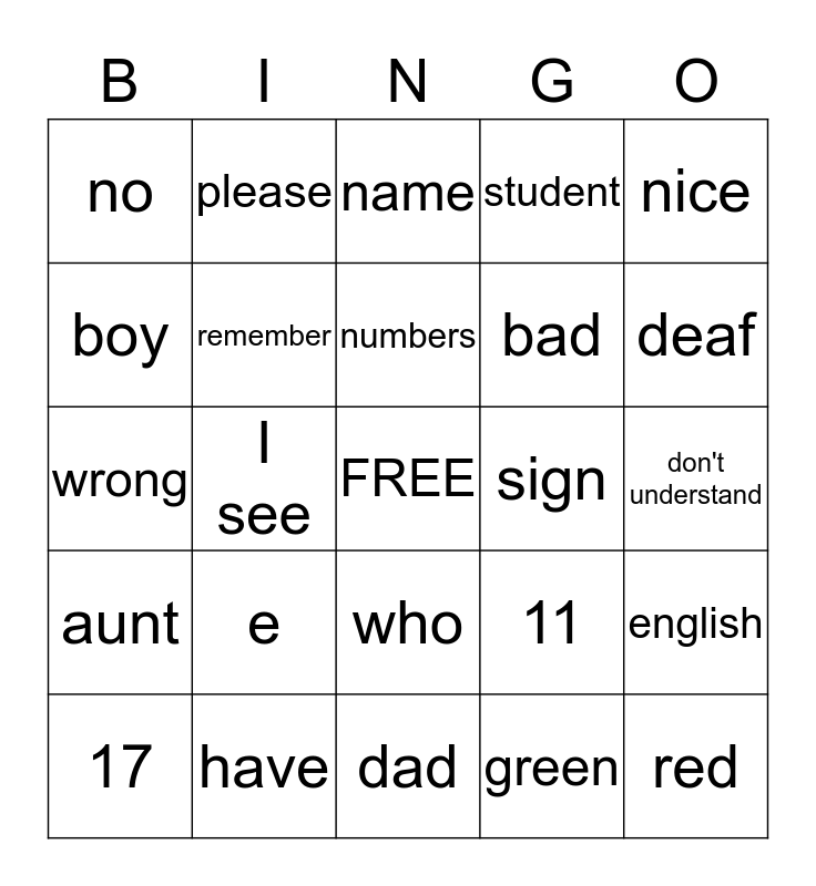 This bingo card has a free space and 24 words: e, have, numbers, 17, nice, no, boy, please, sign, who, bad, wrong, 11, english, remember, green, don't understand, name, deaf, I see, red, aunt, student and dad.
