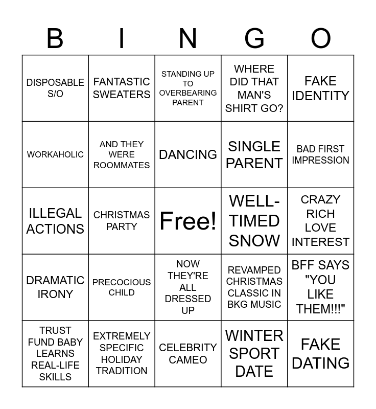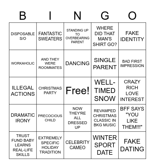 This bingo card has a free space and 34 words: OPENS ON A CITYSCAPE, WINTER SPORT DATE, SECRET MUSICAL TALENT, DEAD PARENT, DRAMATIC IRONY, AND THEY WERE ROOMMATES, FAKE IDENTITY, TRUST FUND BABY LEARNS REAL-LIFE SKILLS, FANTASTIC SWEATERS, FINDING A MORAL COMPASS, DANCING, STANDING UP TO OVERBEARING PARENT, PLOT-CENTRAL FAILING BUSINESS, PRESSURE TO UPHOLD FAMILY LEGACY, WELL-TIMED SNOW, BAD FIRST IMPRESSION, EXTREMELY SPECIFIC HOLIDAY TRADITION, ILLEGAL ACTIONS, PRECOCIOUS CHILD, REVAMPED CHRISTMAS CLASSIC IN BKG MUSIC, NOW THEY'RE ALL DRESSED UP, DECORATING TOGETHER, DISPOSABLE S/O, CRAZY RICH LOVE INTEREST, CELEBRITY CAMEO, FAKE DATING, WHERE DID THAT MAN'S SHIRT GO?, EXTRA SPECIAL ORNAMENT, SINGLE PARENT, WORKAHOLIC, MOMENTARY BREAKUP, CHRISTMAS PARTY, BFF SAYS "YOU LIKE THEM!!!" and GORGEOUS HOUSE.