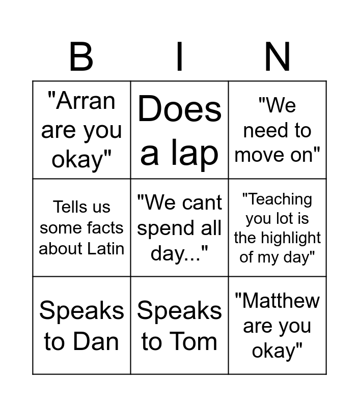 This bingo card has 16 words: Free!, Walks into cupboard, "We need to move on", "Arran are you okay", "Matthew are you okay", Does a lap, "Back in my day...", "Are you still enjoying it", "We cant spend all day...", "Teaching you lot is the highlight of my day", Speaks French, Tells us some facts about Latin, Speaks to Olivier, Speaks to Tom, Speaks to Dan and "Put your pens down please".
