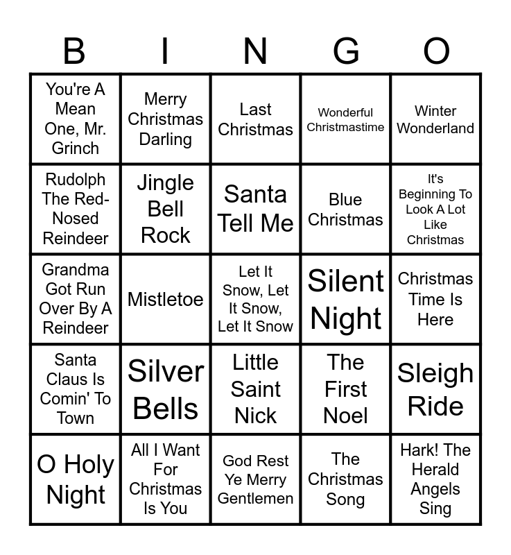 This bingo card has 60 words: Free!, All I Want For Christmas Is You, White Christmas, Santa Claus Is Comin' To Town, The Christmas Song, Jingle Bells, Jingle Bell Rock, What Christmas Means To Me, Blue Christmas, Baby It's Cold Outside, Wonderful Christmastime, Santa Baby, Rudolph The Red-Nosed Reindeer, Mele Kalikimaka, Christmas (Baby Please Come Home), You're A Mean One, Mr. Grinch, Let It Snow, Let It Snow, Let It Snow, Winter Wonderland, Go Tell It On The Mountain, Santa Tell Me, Silent Night, Last Christmas, O Holy Night, Sleigh Ride, Jolly Old St. Nicholas, Frosty The Snowman, I'll Be Home For Christmas, Underneath The Tree, It's Beginning To Look A Lot Like Christmas, Feliz Navidad, Rockin’ Around The Christmas Tree, The 12 Days of Christmas, We Wish You A Merry Christmas, This Christmas, Merry Christmas Darling, Have Yourself A Merry Little Christma, Little Drummer Boy, Mistletoe, Fairytale of New York, Grandma Got Run Over By A Reindeer, Holly Jolly Christmas, Silver Bells, Christmas Time Is Here, We Need A Little Christmas, The First Noel, Happy Xmas (War Is Over), It’s The Most Wonderful Time Of The Year, Joy To The World, Deck The Halls, Little Saint Nick, God Rest Ye Merry Gentlemen, Christmas In Killarney, The Christmas Waltz, Do They Know It’s Christmas?, O Christmas Tree, I Saw Mommy Kissing Santa Claus, Christmas Tree Farm, (There’s No Place Like) Home For The Holidays, Hark! The Herald Angels Sing and Oh Santa!.