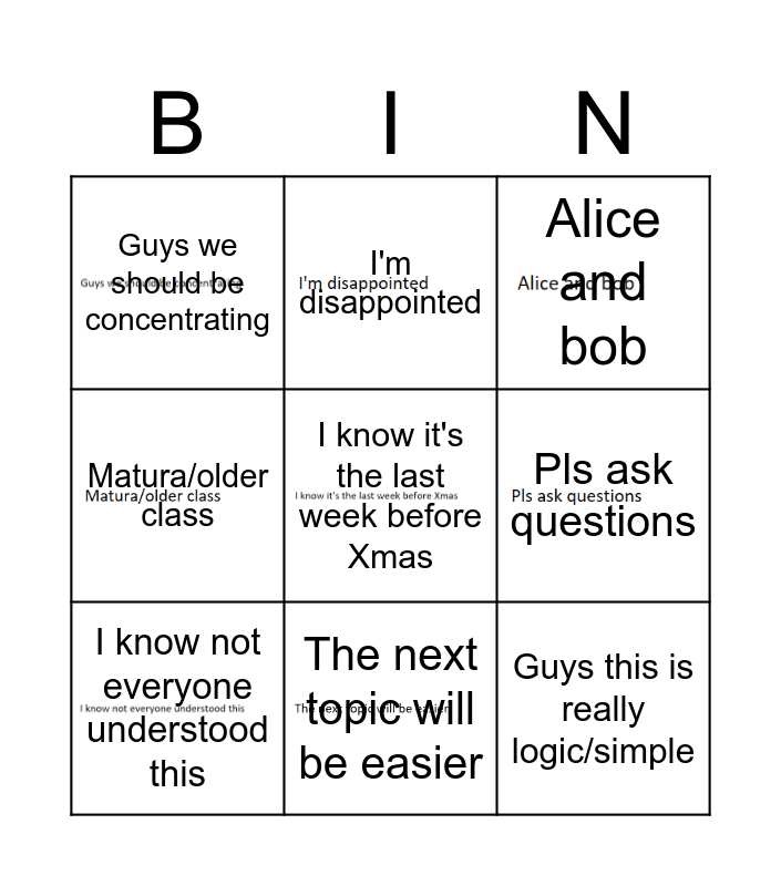 This bingo card has 8 images and 9 words: I know not everyone understood this, I know it's the last week before Xmas, Alice and bob, Guys we should be concentrating, I'm disappointed, Pls ask questions, Matura/older class, The next topic will be easier and Guys this is really logic/simple.