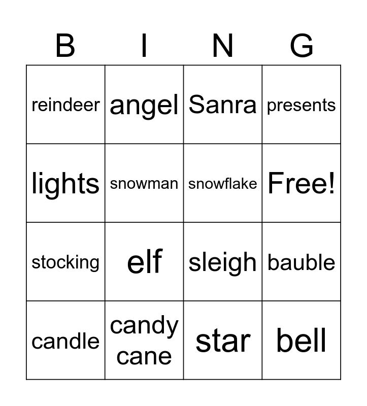 This bingo card has 17 words: star, candle, Sanra, reindeer, elf, presents, bauble, snowflake, Free!, snowman, candy cane, sleigh, lights, angel, stocking, christmas tree and bell.