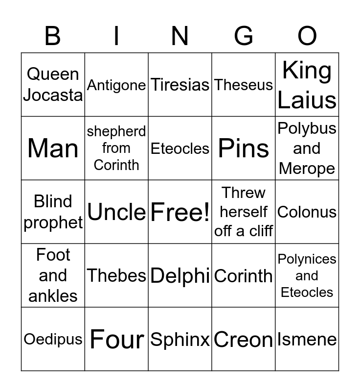 This bingo card has a free space and 24 words: Thebes, Four, Eteocles, Oedipus, King Laius, Queen Jocasta, Man, Antigone, Threw herself off a cliff, Delphi, Pins, Blind prophet, Corinth, Polynices and Eteocles, shepherd from Corinth, Creon, Colonus, Tiresias, Polybus and Merope, Uncle, Ismene, Foot and ankles, Theseus and Sphinx.