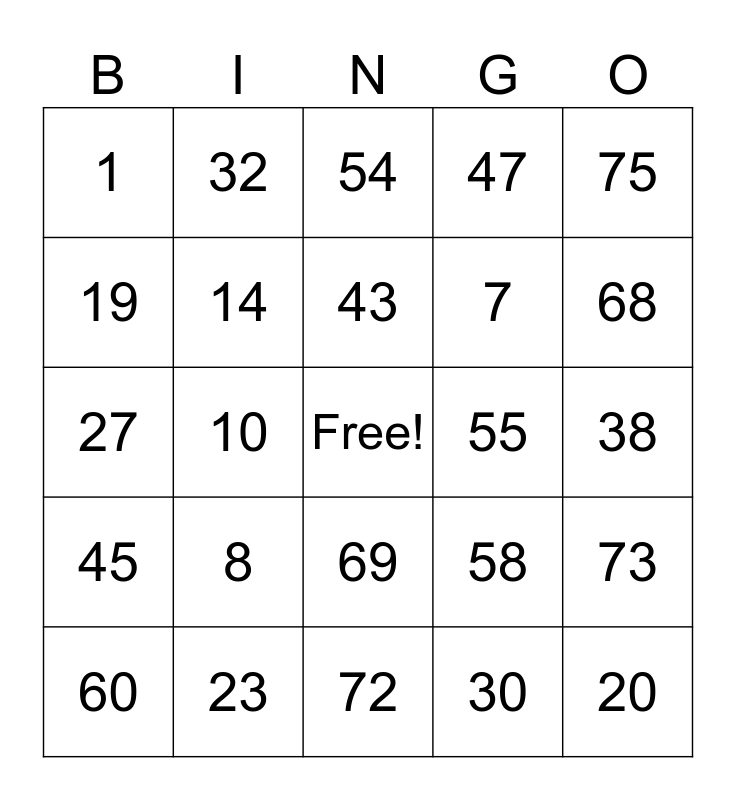 This bingo card has a free space and 24 words: 8, 23, 43, 60, 75, 1, 19, 32, 55, 69, 7, 27, 58, 73, 14, 30, 38, 54, 68, 10, 20, 45, 47 and 72.