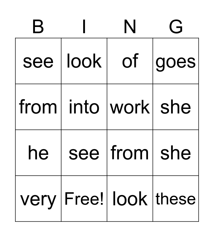 This bingo card has 25 words: work, down, she, play, from, see, into, look, Free!, of, he, from, she, down, work, play, look, of, see, she, very, your, these, goes and does.