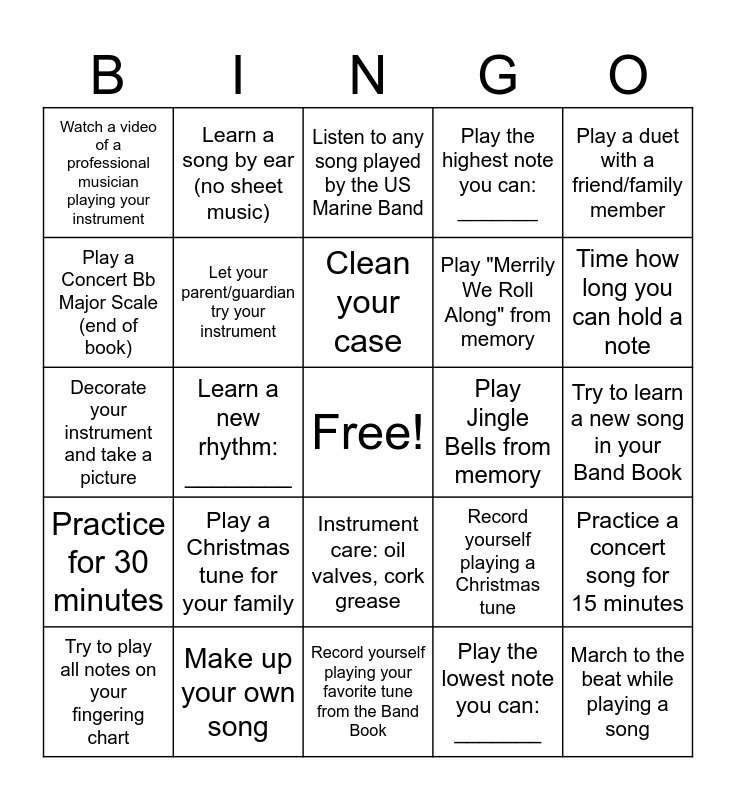 This bingo card has a free space and 24 words: Play a Christmas tune for your family, Make up your own song, Clean your case, Try to play all notes on your fingering chart, Play a duet with a friend/family member, Watch a video of a professional musician playing your instrument, Play a Concert Bb Major Scale (end of book), Learn a song by ear (no sheet music), Play Jingle Bells from memory, Instrument care: oil valves, cork grease, Play "Merrily We Roll Along" from memory, Decorate your instrument and take a picture, Record yourself playing a Christmas tune, Practice a concert song for 15 minutes, Let your parent/guardian try your instrument, Play the lowest note you can: _______, Try to learn a new song in your Band Book, Listen to any song played by the US Marine Band, Time how long you can hold a note, Learn a new rhythm: ________, March to the beat while playing a song, Practice for 30 minutes, Play the highest note you can: _______ and Record yourself playing your favorite tune from the Band Book.