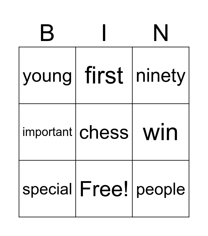 This bingo card has 15 words: the same, different, ninety, young, Free!, chess, together, alotof, win, people, learn, important, special, first and old.
