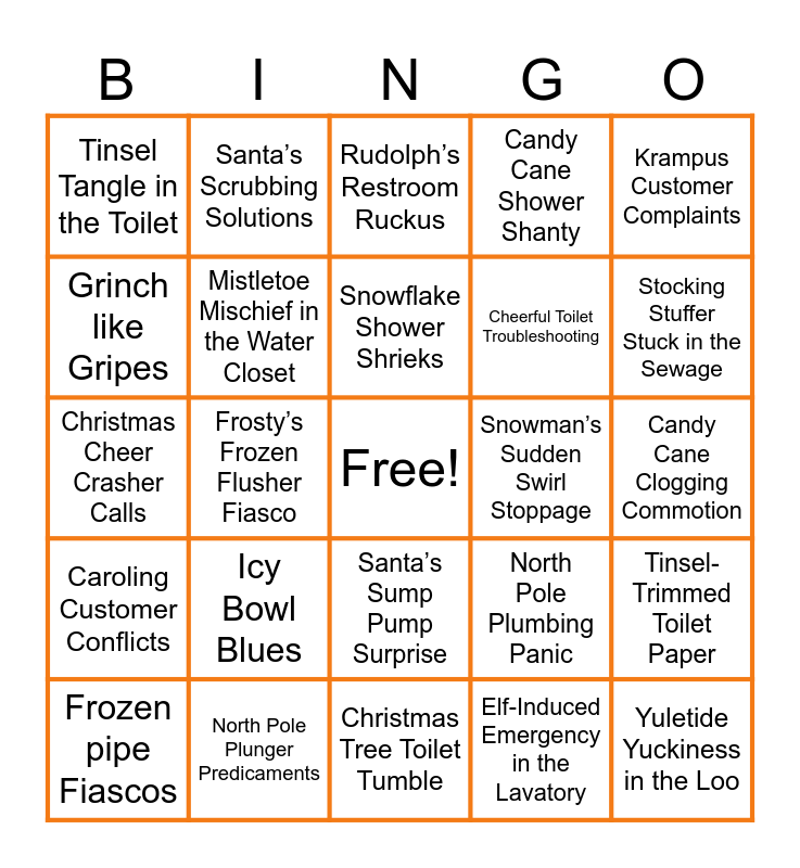 This bingo card has a free space and 29 words: Frozen pipe Fiascos, Jingle Bell Jammed John, Frosty’s Frozen Flusher Fiasco, Santa’s Slipper Seat Situation, Tinsel Tangle in the Toilet, Rudolph’s Restroom Ruckus, Mistletoe Mischief in the Water Closet, Icy Bowl Blues, Snowman’s Sudden Swirl Stoppage, North Pole Plunger Predicaments, Candy Cane Clogging Commotion, Yuletide Yuckiness in the Loo, Christmas Tree Toilet Tumble, Elf-Induced Emergency in the Lavatory, Stocking Stuffer Stuck in the Sewage, Yule Log Lurking in the Loo, Santa’s Sump Pump Surprise, Caroling Customer Conflicts, Krampus Customer Complaints, Christmas Cheer Crasher Calls, North Pole Plumbing Panic, Bah Humbug Backlash, Cheerful Toilet Troubleshooting, Grinch like Gripes, Candy Cane Shower Shanty, Santa’s Scrubbing Solutions, Tinsel-Trimmed Toilet Paper, Snowflake Shower Shrieks and Christmas Carol Commotion in the Commode.
