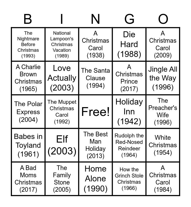 This bingo card has a free space and 50 words: It's a Wonderful Life (1946), A Christmas Carol (1984), Miracle on 34th Street (1947), Home Alone (1990), Elf (2003), A Christmas Story (1983), National Lampoon's Christmas Vacation (1989), The Polar Express (2004), A Charlie Brown Christmas (1965), The Grinch (2000), Love Actually (2003), Die Hard (1988), White Christmas (1954), Rudolph the Red-Nosed Reindeer (1964), Scrooged (1988), Frosty the Snowman (1969), The Santa Clause (1994), Holiday Inn (1942), Home Alone 2: Lost in New York (1992), A Christmas Carol (2009), The Muppet Christmas Carol (1992), How the Grinch Stole Christmas (1966), The Nightmare Before Christmas (1993), A Christmas Prince (2017), Gremlins (1984), The Holiday (2006), Jingle All the Way (1996), A Miracle on 34th Street (1994), A Christmas Carol (1938), The Best Man Holiday (2013), A Christmas Tale (2008), The Bishop's Wife (1947), Trading Places (1983), Christmas in Connecticut (1945), The Family Stone (2005), Scrooge (1970), Arthur Christmas (2011), The Christmas Chronicles (2018), Serendipity (2001), The Preacher's Wife (1996), Four Christmases (2008), The Shop Around the Corner (1940), The Apartment (1960), Krampus (2015), A Bad Moms Christmas (2017), The Polar Express (2004), Meet Me in St. Louis (1944), The Christmas Chronicles 2 (2020), Babes in Toyland (1961) and Last Holiday (2006).