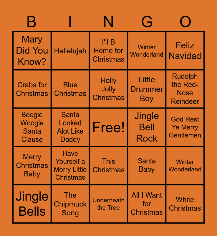 This bingo card has a free space and 34 words: Rockin' Around the Chrismas Tree, All I Want for Christmas, Little Saint Nick, Hark the Herald Angels Sing, Merry Christmas Baby, Blue Christmas, Feliz Navidad, Jingle Bells, Hallelujah, Santa Clause is Coming to Town, Holly Jolly Christmas, I'll B Home for Christmas, Favorite Time of Year, What Christmas Means To Me, Jingle Bell Rock, Rudolph the Red-Nose Reindeer, The Chipmuck Song, Boogie Woogie Santa Clause, Have Yourself a Merry Little Christmas, Santa Baby, This Christmas, You Make It Feel Like Christmas, Mary Did You Know?, God Rest Ye Merry Gentlemen, Underneath the Tree, White Christmas, Winter Wonderland, Christmas Tree Farm, Little Drummer Boy, Crabs for Christmas, Mambo Santa Mambo, Santa Looked Alot Like Daddy, Winter Wonderland and Donde Esta Santa Claus.
