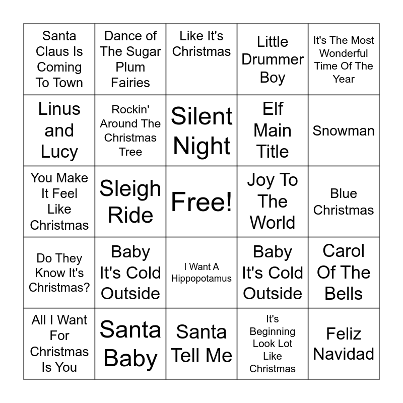 This bingo card has a free space and 29 words: All I Want For Christmas Is You, Jingle Bell Rock, Sleigh Ride, Run Rudolph Run, Santa Claus Is Coming To Town, Like It's Christmas, Rockin' Around The Christmas Tree, Baby It's Cold Outside, Joy To The World, Santa Baby, Blue Christmas, Feliz Navidad, Santa Tell Me, It's Beginning Look Lot Like Christmas, Snowman, Last Christmas, I Want A Hippopotamus, Do They Know It's Christmas?, It's The Most Wonderful Time Of The Year, You Make It Feel Like Christmas, Baby It's Cold Outside, O Holy Night, Elf Main Title, Linus and Lucy, Little Drummer Boy, Dance of The Sugar Plum Fairies, Carol Of The Bells, Silent Night and Mistletoe.