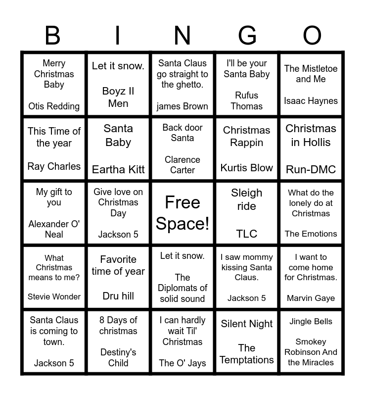 This bingo card has a free space and 34 words: Someday at Christmas Stevie Wonder, Silent Night The Temptations, Sleigh Ride Alexander O' Neal, Give love on Christmas day. Johnny Gill, What Christmas means to me? Stevie Wonder, Santa Baby Eartha Kitt, The Mistletoe and Me Isaac Haynes, Santa Claus is coming to town. Jackson 5, Let it snow. Boyz II Men, Winter Wonderland Aretha Franklin, Back door Santa Clarence Carter, Santa Claus go straight to the ghetto. james Brown, Just another Christmas song Sharon Jones and the Daps-Kings, Christmas love Rotary Connection, Sleigh ride TLC, Christmas in Hollis Run-DMC, 8 Days of christmas Destiny's Child, My gift to you Alexander O' Neal, Favorite time of year Dru hill, I saw mommy kissing Santa Claus. Jackson 5, Let it snow. The Diplomats of solid sound, This Christmas Donny Hathaway, Merry Christmas Baby Otis Redding, What do the lonely do at Christmas The Emotions, I can hardly wait Til' Christmas The O' Jays, Jingle Bells Smokey Robinson And the Miracles, I'll be your Santa Baby Rufus Thomas, Black Christmas The Emotions, Christmas Rappin Kurtis Blow, This Time of the year Ray Charles, Christmas I'll Be steppin R. Kelly, Give love on Christmas Day Jackson 5, I want to come home for Christmas. Marvin Gaye and The Christmas Song Nat "King" Cole.