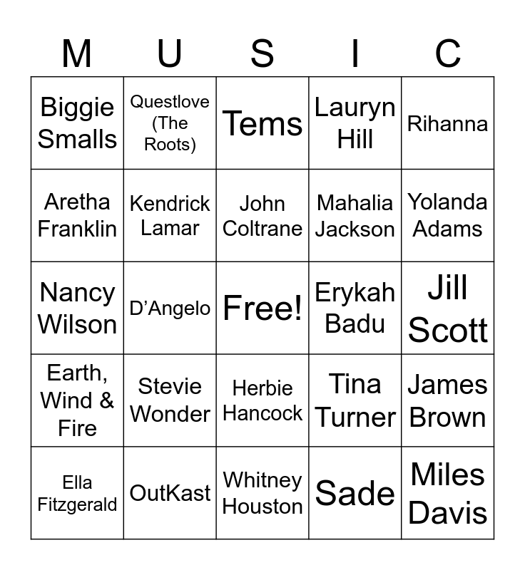 This bingo card has a free space and 48 words: Beyoncé, Miles Davis, Prince, Whitney Houston, Stevie Wonder, Nina Simone, Questlove (The Roots), Marvin Gaye, Aretha Franklin, Jimi Hendrix, Kendrick Lamar, Lauryn Hill, James Brown, Tina Turner, Ray Charles, Missy Elliott, John Coltrane, Erykah Badu, Tupac Shakur, Rihanna, D’Angelo, Sade, Biggie Smalls, Mahalia Jackson, Kirk Franklin, Yolanda Adams, Ella Fitzgerald, Thelonious Monk, Herbie Hancock, Earth, Wind & Fire, Curtis Mayfield, Chaka Khan, Nas, Megan Thee Stallion, OutKast, MC Lyte, Ice Cube, Jill Scott, Frank Ocean, H.E.R., Maxwell, Bob Marley, Tems, Janelle Monae, Nancy Wilson, Natalie Cole, Burna Boy and Samara Joy.