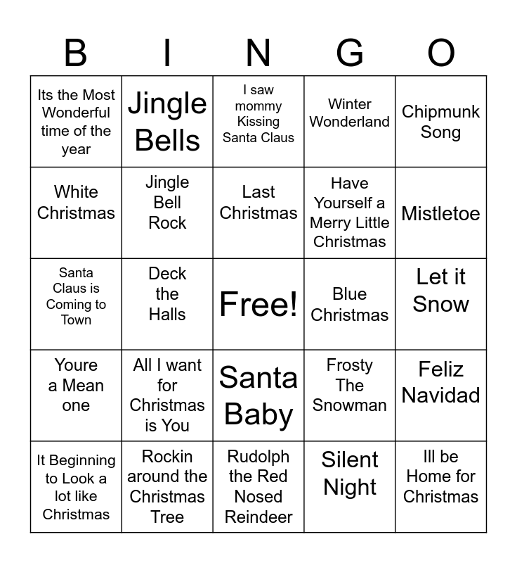 This bingo card has a free space and 24 words: All I want for Christmas is You, Rockin around the Christmas Tree, Last Christmas, It Beginning to Look a lot like Christmas, Chipmunk Song, Its the Most Wonderful time of the year, White Christmas, Jingle Bells, Blue Christmas, Santa Baby, Have Yourself a Merry Little Christmas, Santa Claus is Coming to Town, Frosty The Snowman, Feliz Navidad, Jingle Bell Rock, Silent Night, Let it Snow, I saw mommy Kissing Santa Claus, Mistletoe, Deck the Halls, Ill be Home for Christmas, Youre a Mean one, Winter Wonderland and Rudolph the Red Nosed Reindeer.