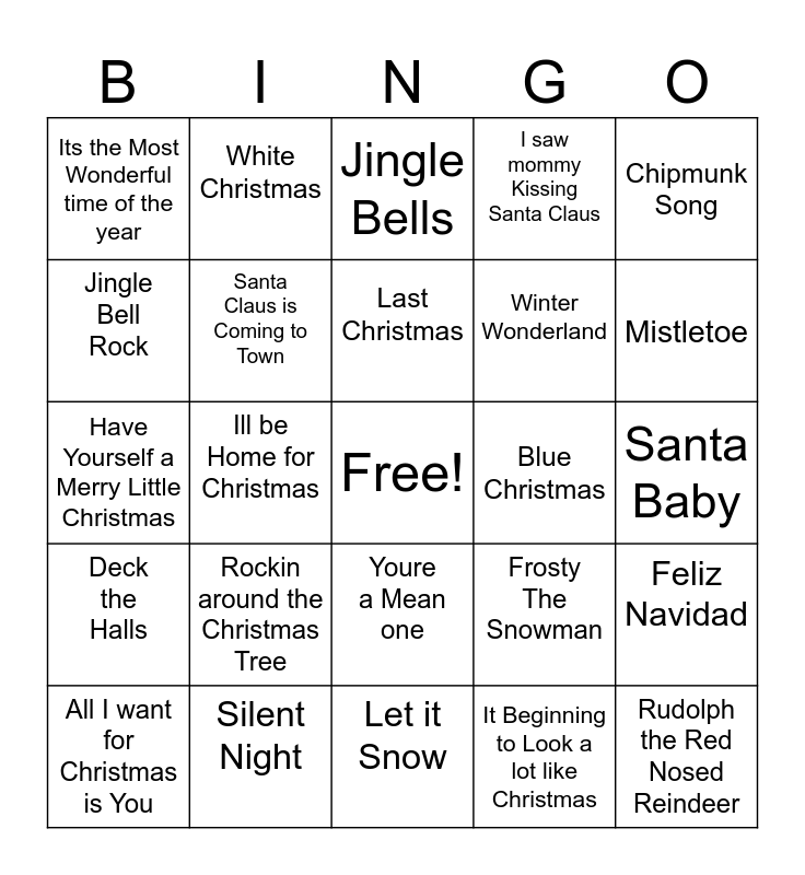 This bingo card has a free space and 24 words: All I want for Christmas is You, Rockin around the Christmas Tree, Last Christmas, It Beginning to Look a lot like Christmas, Chipmunk Song, Its the Most Wonderful time of the year, White Christmas, Jingle Bells, Blue Christmas, Santa Baby, Have Yourself a Merry Little Christmas, Santa Claus is Coming to Town, Frosty The Snowman, Feliz Navidad, Jingle Bell Rock, Silent Night, Let it Snow, I saw mommy Kissing Santa Claus, Mistletoe, Deck the Halls, Ill be Home for Christmas, Youre a Mean one, Winter Wonderland and Rudolph the Red Nosed Reindeer.