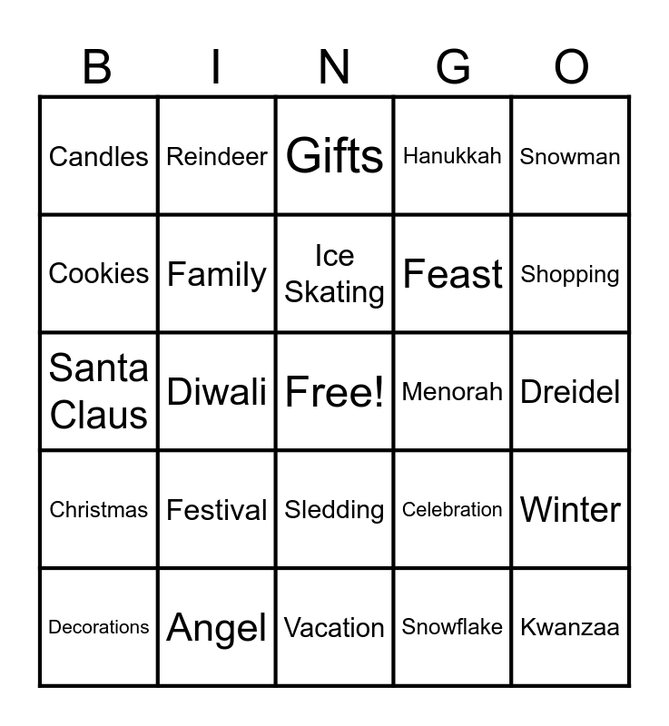 This bingo card has a free space and 40 words: Lights, Santa Claus, Nativity, Family, Angel, Sledding, Ice Skating, Resolutions, Snowman, Christmas, Diwali, Hanukkah, Kwanzaa, Dreidel, Menorah, Festival, Party, Candles, Kinara, Gifts, Winter, Snowflake, Feast, Cookies, Hot Chocolate, Wreath, Stocking, Ornament, Joy, Bells, Mistletoe, Decorations, Cozy, Celebration, Shopping, Vacation, Cheer, Fireworks, Reindeer and Garland.