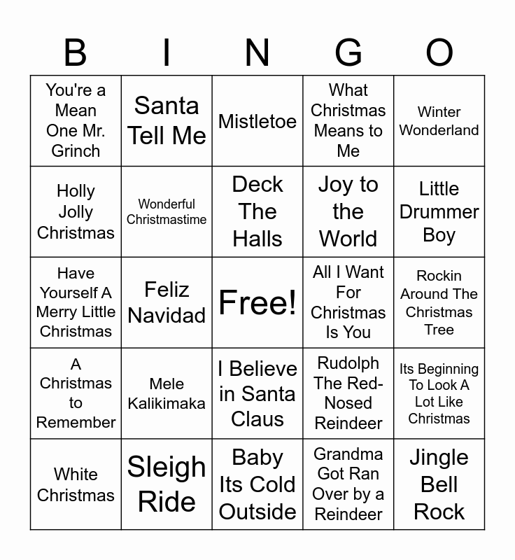 This bingo card has a free space and 29 words: White Christmas, Spirit of Christmas, Feliz Navidad, Do They Know Its Christmas, You're a Mean One Mr. Grinch, Mistletoe, Wonderful Christmastime, Mele Kalikimaka, All I Want For Christmas Is You, Sleigh Ride, Rockin Around The Christmas Tree, Jingle Bell Rock, Baby Its Cold Outside, Grandma Got Ran Over by a Reindeer, Little Drummer Boy, Last Christmas, I Believe in Santa Claus, A Christmas to Remember, Winter Wonderland, Have Yourself A Merry Little Christmas, Rudolph The Red-Nosed Reindeer, Santa Claus Is Coming to Town, Joy to the World, Holly Jolly Christmas, What Christmas Means to Me, Santa Tell Me, Its Beginning To Look A Lot Like Christmas, Deck The Halls and Let It Snow Let It Snow Let it Snow.