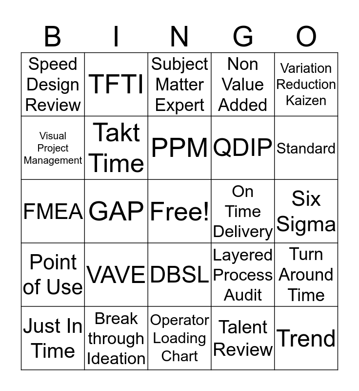 This bingo card has a free space and 24 words: VAVE, Break through Ideation, PPM, Just In Time, Variation Reduction Kaizen, Speed Design Review, Visual Project Management, TFTI, On Time Delivery, DBSL, QDIP, FMEA, Layered Process Audit, Turn Around Time, Takt Time, Talent Review, Six Sigma, Subject Matter Expert, Standard, GAP, Trend, Point of Use, Non Value Added and Operator Loading Chart.
