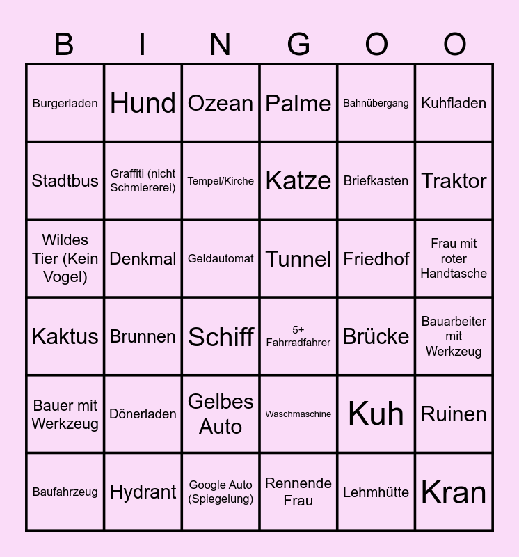 This bingo card has 36 words: Waschmaschine, Gelbes Auto, Rennende Frau, Stadtbus, Kaktus, Tunnel, Graffiti (nicht Schmiererei), Google Auto (Spiegelung), Bahnübergang, Kuh, Traktor, Palme, Ruinen, Denkmal, Katze, Burgerladen, Bauer mit Werkzeug, Friedhof, Wildes Tier (Kein Vogel), Ozean, Geldautomat, Brunnen, 5+ Fahrradfahrer, Schiff, Brücke, Hund, Briefkasten, Hydrant, Tempel/Kirche, Kuhfladen, Kran, Baufahrzeug, Bauarbeiter mit Werkzeug, Frau mit roter Handtasche, Dönerladen and Lehmhütte.
