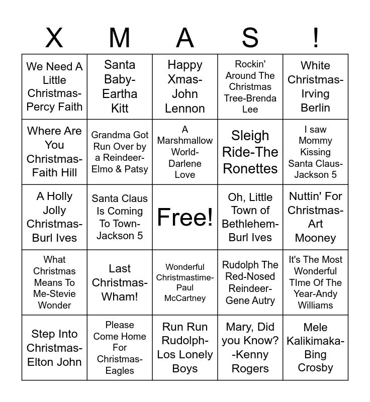 This bingo card has a free space and 49 words: All I Want For Christmas Is You-Mariah Carey, Mele Kalikimaka-Bing Crosby, I Want A Hippopotamus For Christmas-Gayla Peevey, Run Run Rudolph-Los Lonely Boys, Last Christmas-Wham!, Feliz Navidad-Jose Feliciano, Santa Baby-Eartha Kitt, Jingle Bell Rock-Hall & Oats, Where Are You Christmas-Faith Hill, You're A Mean One, Mr Grinch-Thurl Ravenscroft, Grandma Got Run Over by a Reindeer-Elmo & Patsy, Rockin' Around The Christmas Tree-Brenda Lee, It's The Most Wonderful TIme Of The Year-Andy Williams, Rudolph The Red-Nosed Reindeer-Gene Autry, Here Comes Santa Claus-Gene Autry, Christmas Time Is Here-Vince Guaraldi Trio, A Marshmallow World-Darlene Love, Oh, Little Town of Bethlehem-Burl Ives, Blue Christmas-Elvis Presley, White Christmas-Irving Berlin, Santa Claus Is Coming To Town-Jackson 5, Mary, Did you Know?-Kenny Rogers, We Need A Little Christmas-Percy Faith, Sleigh Ride-The Ronettes, Do They Know It's Christmas?-Band Aid, I saw Mommy Kissing Santa Claus-Jackson 5, Step Into Christmas-Elton John, The Chipmunk Song-The Chipmunks, Wonderful Christmastime-Paul McCartney, What Christmas Means To Me-Stevie Wonder, Underneath The Tree-Kelly Clarkson, Believe-Josh Groban, There's No Place Like Home for the Holidays-Perry Como, Merry Christmas, Happy Holidays-NSYNC, Please Come Home For Christmas-Eagles, Deck The Hall-Nat King Cole, The Christmas Shoes-Newsong, Hot Chocolate-Tom Hanks, Nuttin' For Christmas-Art Mooney, Twelve Days Of Christmas-John Denver, The First Noel-Andy Williams, Nutcracker Suite-Pyotr Ilyich Tchaikovsky, Baby It's Cold Outside-Idina Menzel, We Wish You A Merry Christmas-John Denver, A Holly Jolly Christmas-Burl Ives, Happy Xmas-John Lennon, Christmas Eve-Savatage, The Little Drummer Boy-Harry Simeone Chorale and One Little Christmas Tree-Stevie Wonder.