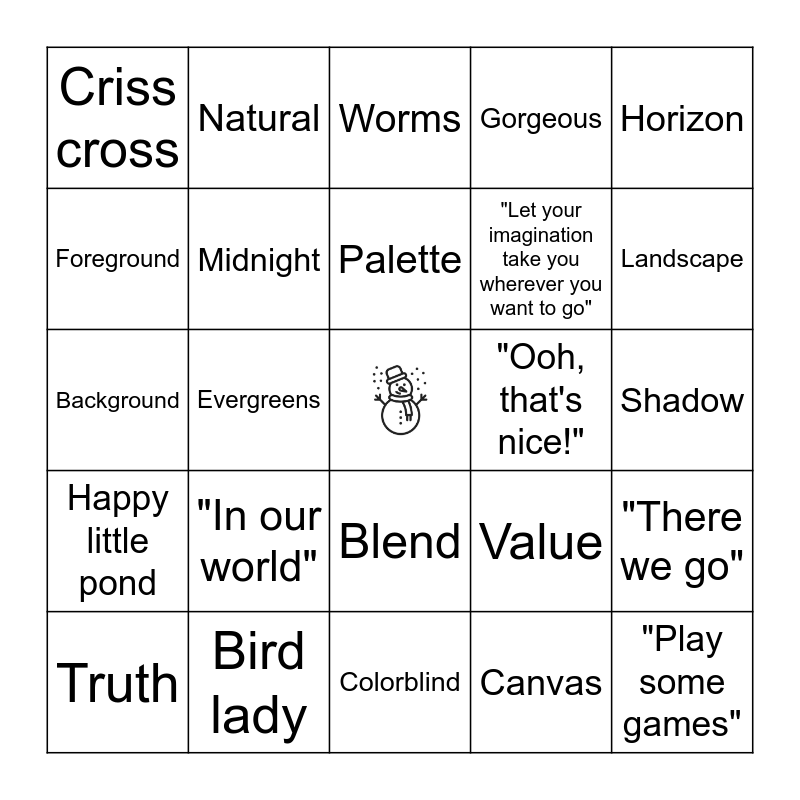 This bingo card has a free space and 29 words: Truth, Overcast, Evergreens, Birds, Criss cross, Worms, Midnight, "In our world", "Ooh, that's nice!", Bird lady, Shadow, "Play some games", Colorblind, Canvas, Landscape, Reflection, Blend, Happy little pond, Horizon, Background, Value, Layer, "Let your imagination take you wherever you want to go", Foreground, Gorgeous, Natural, "There we go", Palette and Super easy.
