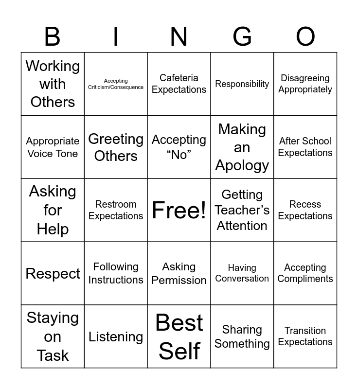 This bingo card has a free space and 24 words: Following Instructions, Listening, Accepting “No”, Staying on Task, Disagreeing Appropriately, Working with Others, Appropriate Voice Tone, Accepting Criticism/Consequence, Getting Teacher’s Attention, Asking Permission, Making an Apology, Asking for Help, Having Conversation, Accepting Compliments, Greeting Others, Sharing Something, Recess Expectations, Cafeteria Expectations, After School Expectations, Restroom Expectations, Transition Expectations, Respect, Responsibility and Best Self.