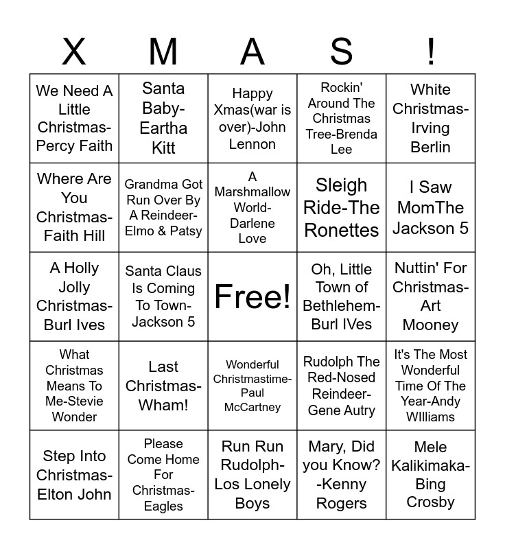 This bingo card has a free space and 49 words: All I Want For Christmas Is You-Mariah Carey, Mele Kalikimaka-Bing Crosby, I Want A Hippopotamus For Christmas-Gayla Peevey, Run Run Rudolph-Los Lonely Boys, Last Christmas-Wham!, Feliz Navidad-Jose Feliciano, Santa Baby-Eartha Kitt, Jingle Bell Rock-Hall & Oats, Where Are You Christmas-Faith Hill, You're A Mean One, Mr Grinch-Thurl Ravenscroft, Grandma Got Run Over By A Reindeer-Elmo & Patsy, Rockin' Around The Christmas Tree-Brenda Lee, It's The Most Wonderful Time Of The Year-Andy WIlliams, Rudolph The Red-Nosed Reindeer-Gene Autry, Here Comes Santa Claus-Gene Autry, Christmas Time Is Here-Vince Guaraldi Trio, A Marshmallow World-Darlene Love, Oh, Little Town of Bethlehem-Burl IVes, Blue Christmas-Elvis Presley, White Christmas-Irving Berlin, Santa Claus Is Coming To Town-Jackson 5, Mary, Did you Know?-Kenny Rogers, We Need A Little Christmas-Percy Faith, Sleigh Ride-The Ronettes, Do They Know It's Christmas?-Band Aid, I Saw MomThe Jackson 5, Step Into Christmas-Elton John, The Chipmunk Song-The Chipmunks, Wonderful Christmastime-Paul McCartney, What Christmas Means To Me-Stevie Wonder, Underneath The Tree-Kelly Clarkson, Believe-Josh Groban, There's No Place Like Home for the Holidays-Perry Como, Merry Christmas, Happy Holidays-NSYNC, Please Come Home For Christmas-Eagles, Deck The Hall-Nat King Cole, The Christmas Shoes-Newsong, Hot Chocolate-Tom Hanks, Nuttin' For Christmas-Art Mooney, Twelve Days of Christmas-John Denver, The First Noel-Andy Williams, Nutcraker Suite-Pyotr Ilyich Tchaikovsky, Baby Its Cold Outside-Idina Menzel, We Wish You A Merry Christmas-John Denver, A Holly Jolly Christmas-Burl Ives, Happy Xmas(war is over)-John Lennon, Christmas Eve-Savatage, The Little Drummer Boy-Harry Simeone Chorale and One Little Christmas Tree-Stevie Wonder.