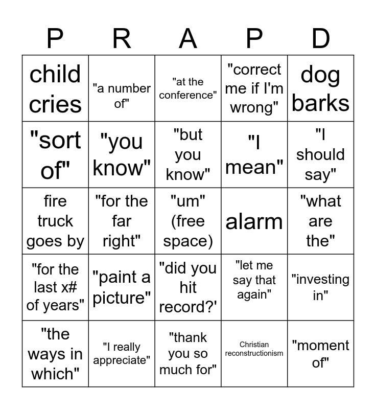 This bingo card has a free space and 24 words: "paint a picture", "I really appreciate", "but you know", "the ways in which", dog barks, child cries, "sort of", "a number of", alarm, "did you hit record?', "I mean", fire truck goes by, "let me say that again", "investing in", "you know", Christian reconstructionism, "what are the", "at the conference", "I should say", "for the far right", "moment of", "for the last x# of years", "correct me if I'm wrong" and "thank you so much for".