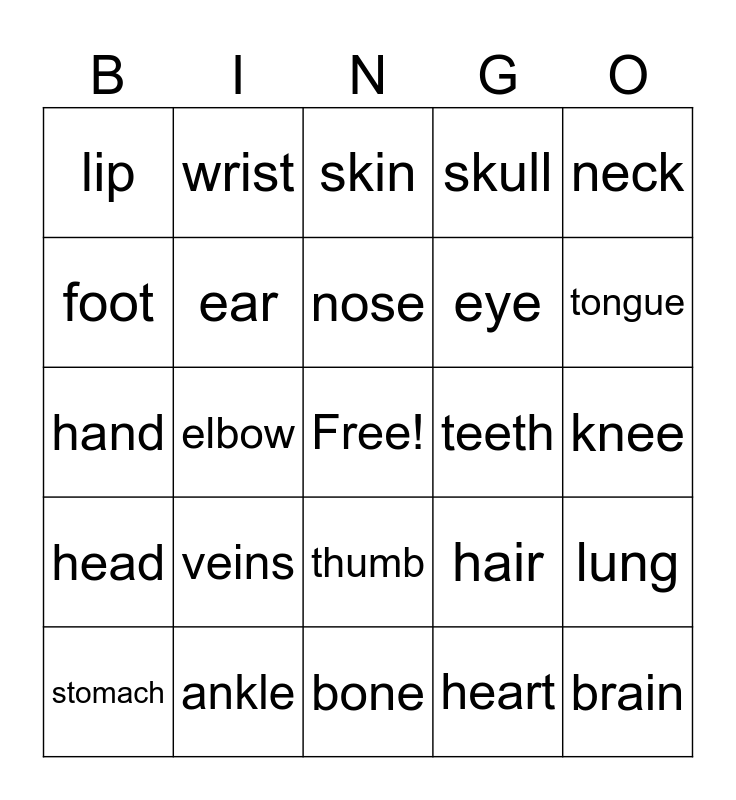 This bingo card has a free space and 24 words: veins, ankle, nose, stomach, neck, lip, foot, wrist, teeth, thumb, eye, hand, hair, lung, ear, heart, knee, skin, tongue, elbow, brain, head, skull and bone.