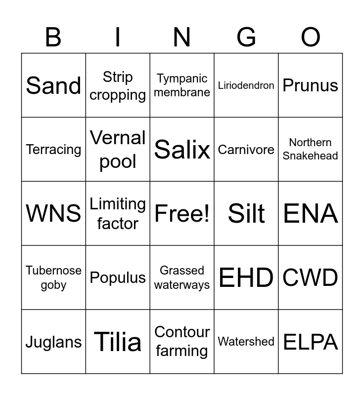 This bingo card has a free space and 24 words: Populus, Tilia, Salix, Juglans, Prunus, Sand, Terracing, Strip cropping, Silt, Grassed waterways, Carnivore, WNS, EHD, CWD, Vernal pool, Watershed, ENA, Tympanic membrane, Northern Snakehead, Limiting factor, ELPA, Tubernose goby, Liriodendron and Contour farming.