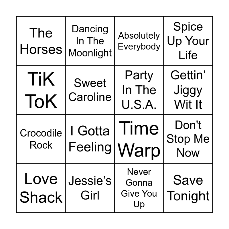 This bingo card has 20 words: Don't Stop Me Now, Celebration, Absolutely Everybody, Come on Eileen, Love Shack, TiK ToK, Jessie’s Girl, The Horses, Crocodile Rock, Dancing In The Moonlight, I Gotta Feeling, Time Warp, Sweet Caroline, Save Tonight, Party In The U.S.A., Walking On Sunshine, Gettin’ Jiggy Wit It, Spice Up Your Life, Never Gonna Give You Up and Macarena.