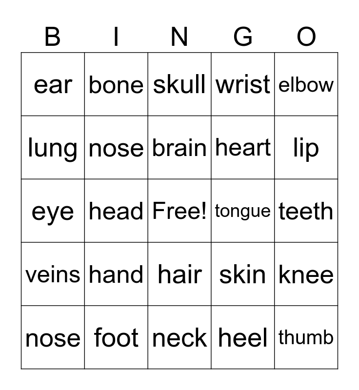 This bingo card has a free space and 24 words: hand, foot, brain, nose, elbow, ear, lung, bone, tongue, hair, heart, eye, skin, knee, nose, heel, teeth, skull, lip, head, thumb, veins, wrist and neck.