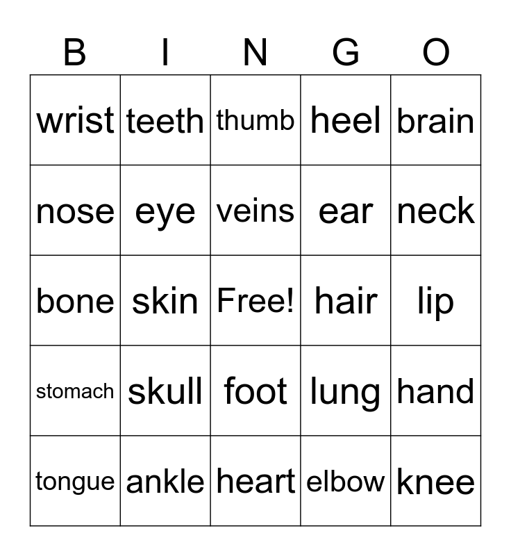 This bingo card has a free space and 24 words: skull, ankle, veins, tongue, brain, wrist, nose, teeth, hair, foot, ear, bone, lung, hand, eye, elbow, lip, thumb, neck, skin, knee, stomach, heel and heart.
